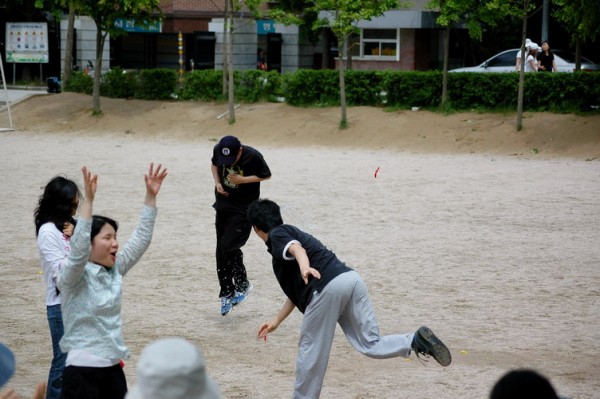 물풍선 맞는 사람과 환호 하는 사람...